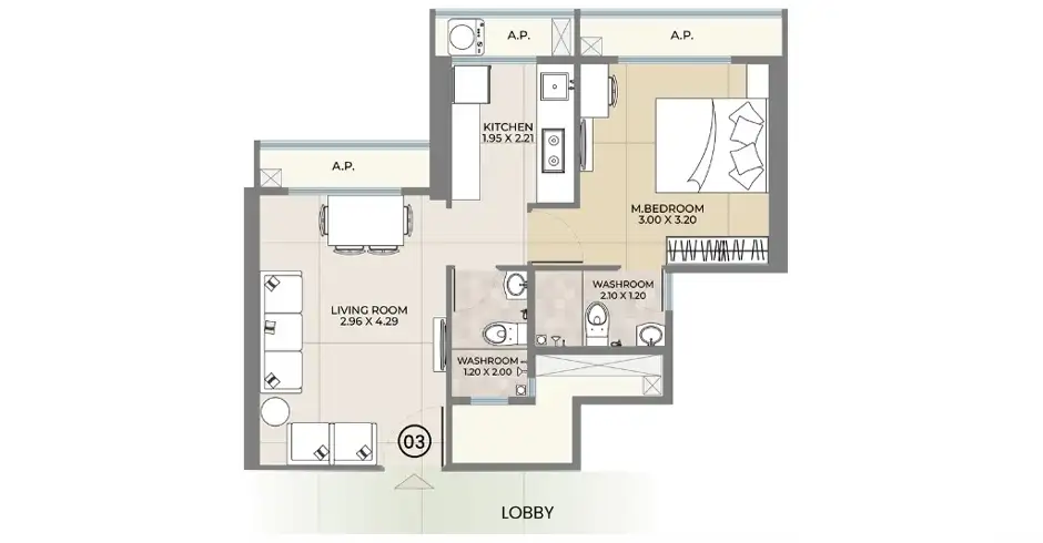 A: Rex Residency offers 1 & 2 BHK flats and residences with well-ventilated interiors, optimized layouts, and carpet areas starting from 398+ sq.ft..